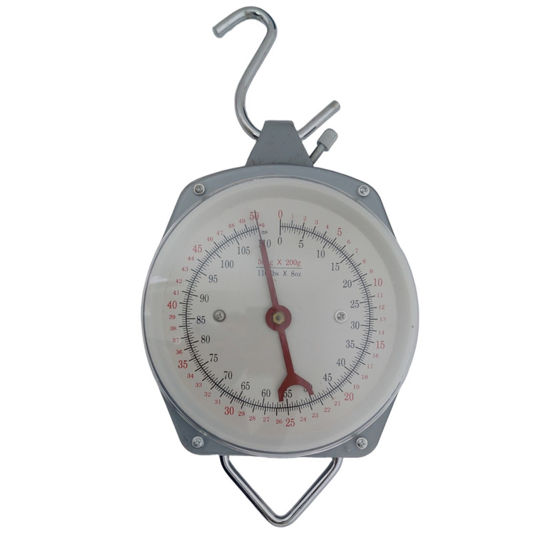 ترازوی ماهیگیری ۵۰ کیلوگرمی عقربهای با بدنه مقاوم و قلاب فلزی محکم، مناسب صید، سفر و کارگاه. بدون نیاز به باتری، سبک و قابل حمل با دقت بالا.